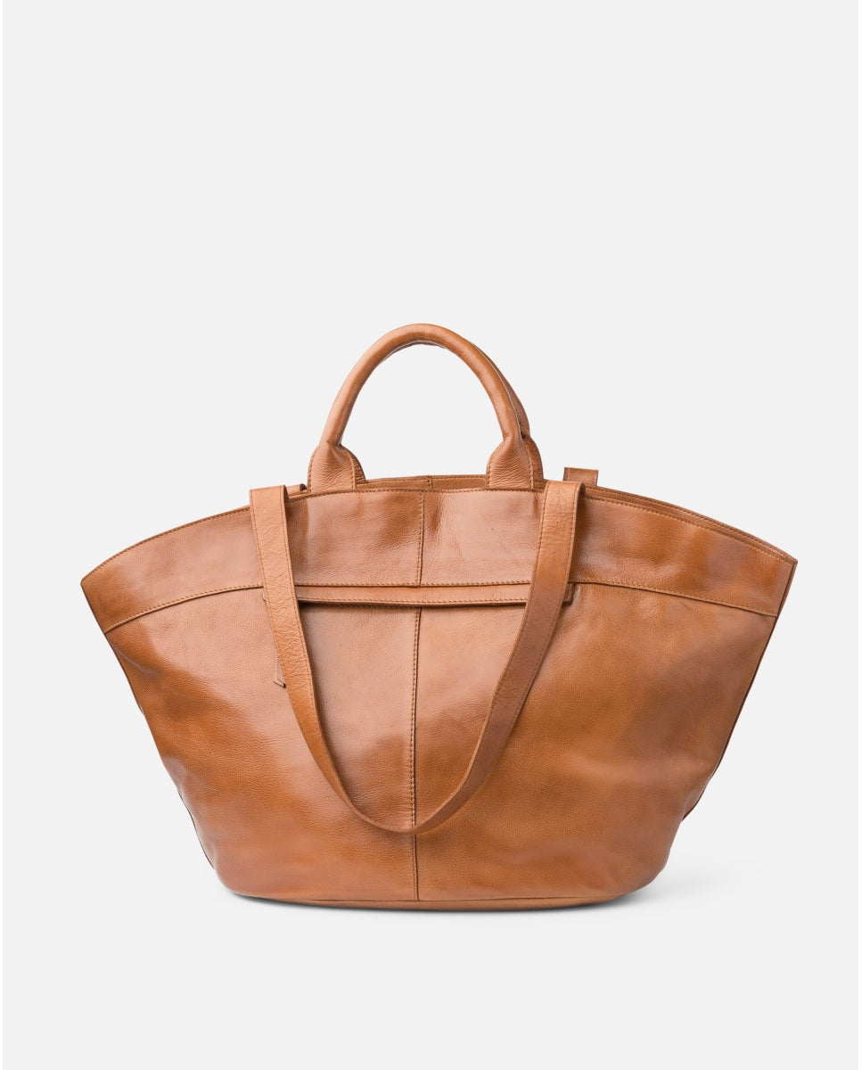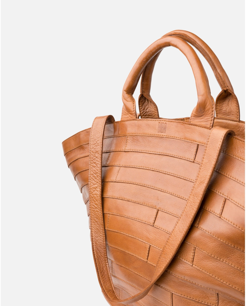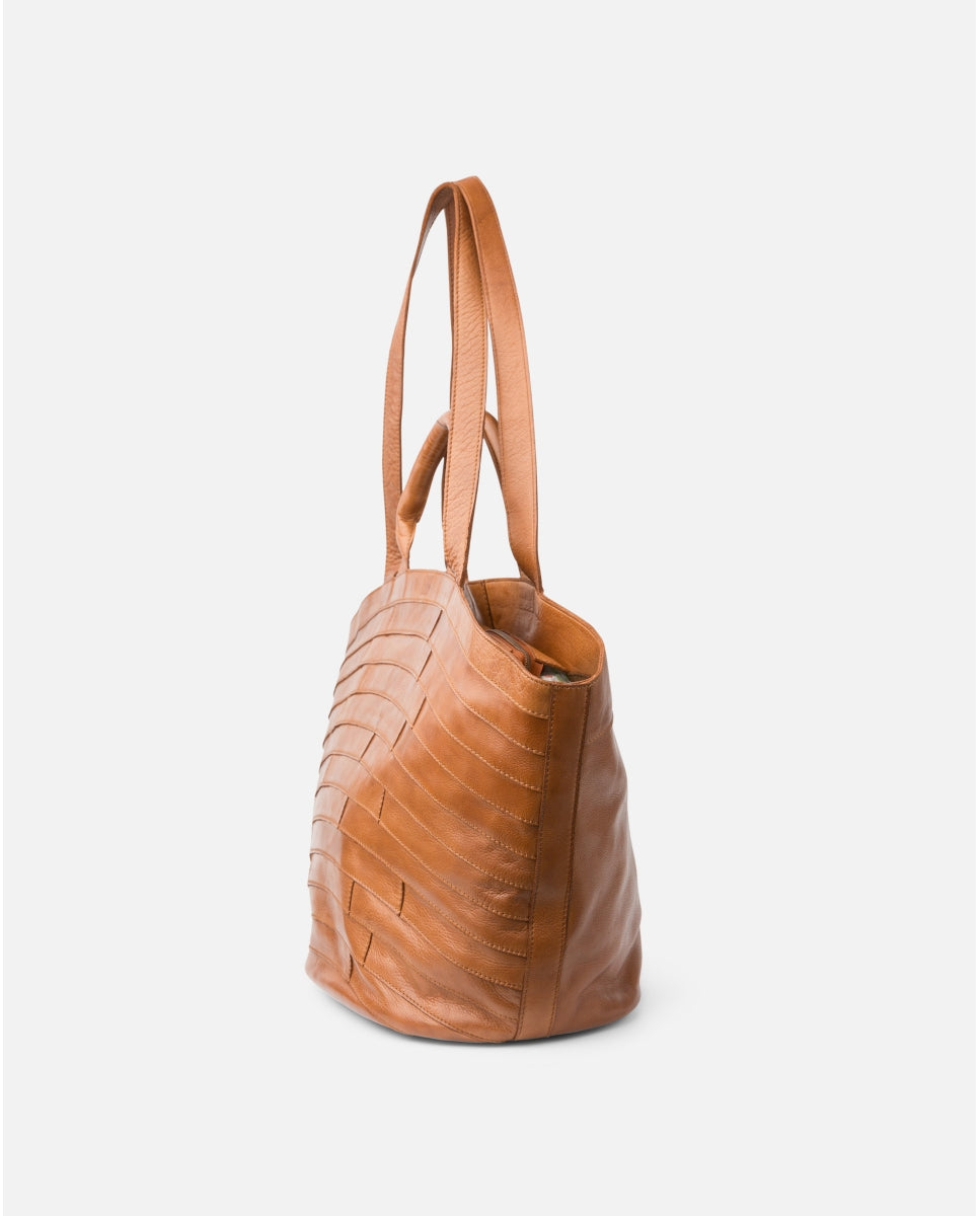 Large washed cowhide backet bag. The rectangular patchwork on the front stands out.