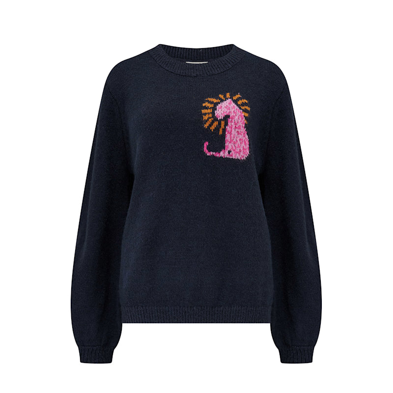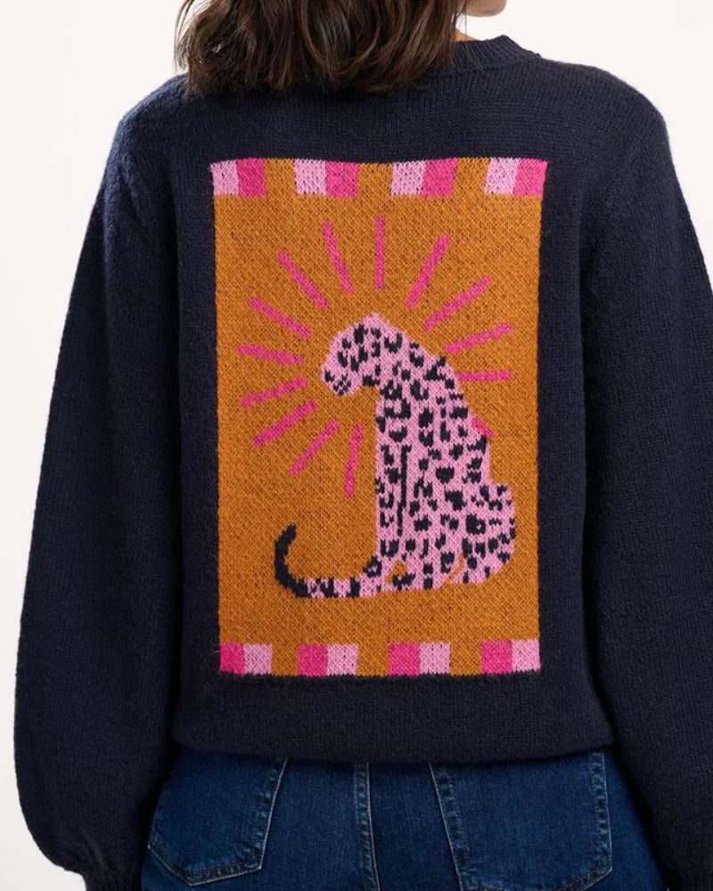The standout detail? A bold pink leopard motif with navy spots, framed by radiant orange lines and a playful checker pattern – adding a touch of fun to your knitwear collection.