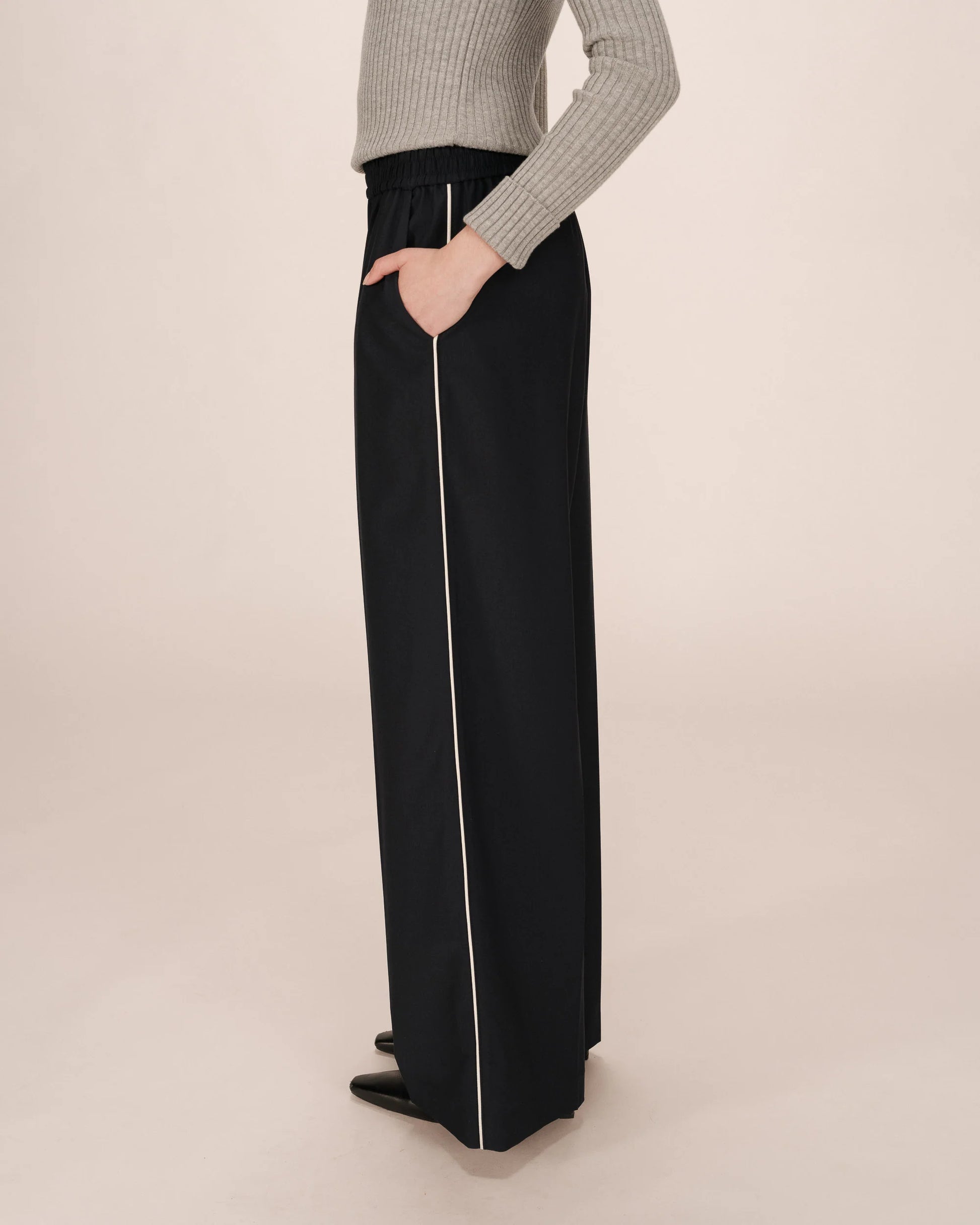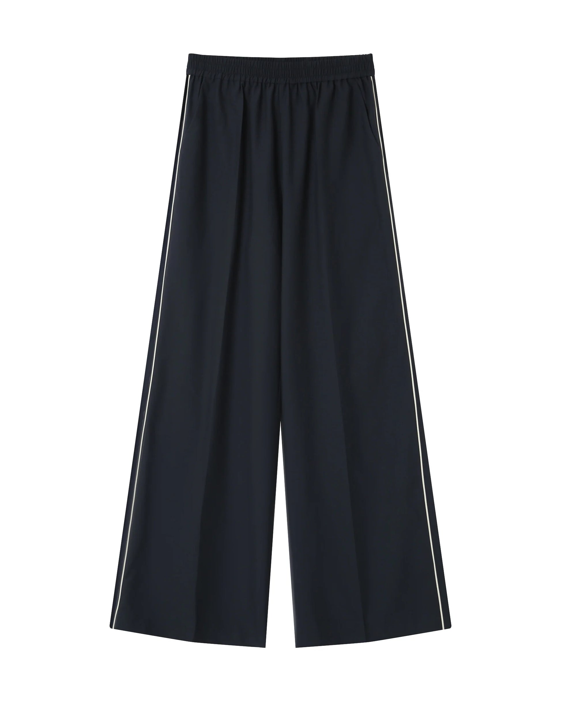 A sportsluxe, wide leg trouser with a elasticated waist.