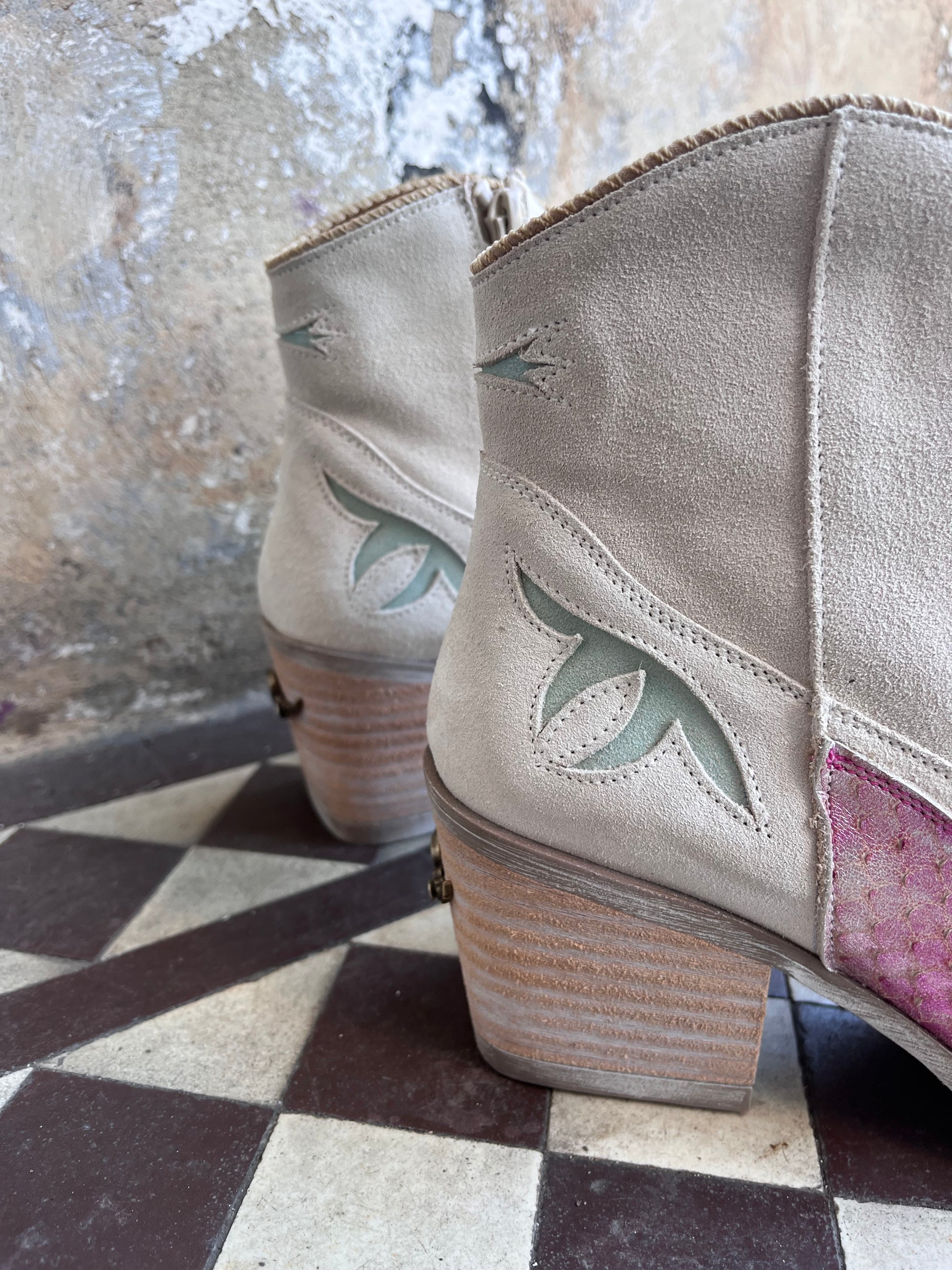 Ivory suede boots with a pink snake effect front and cut-out mint coloured trim.