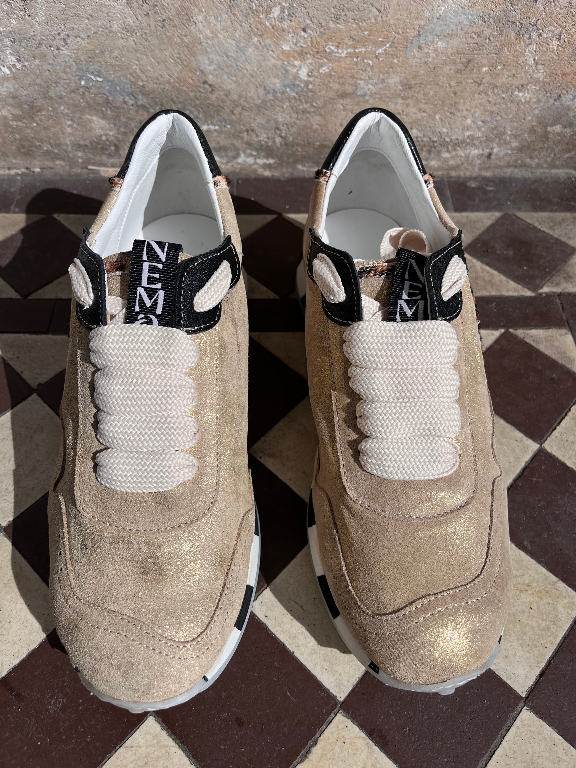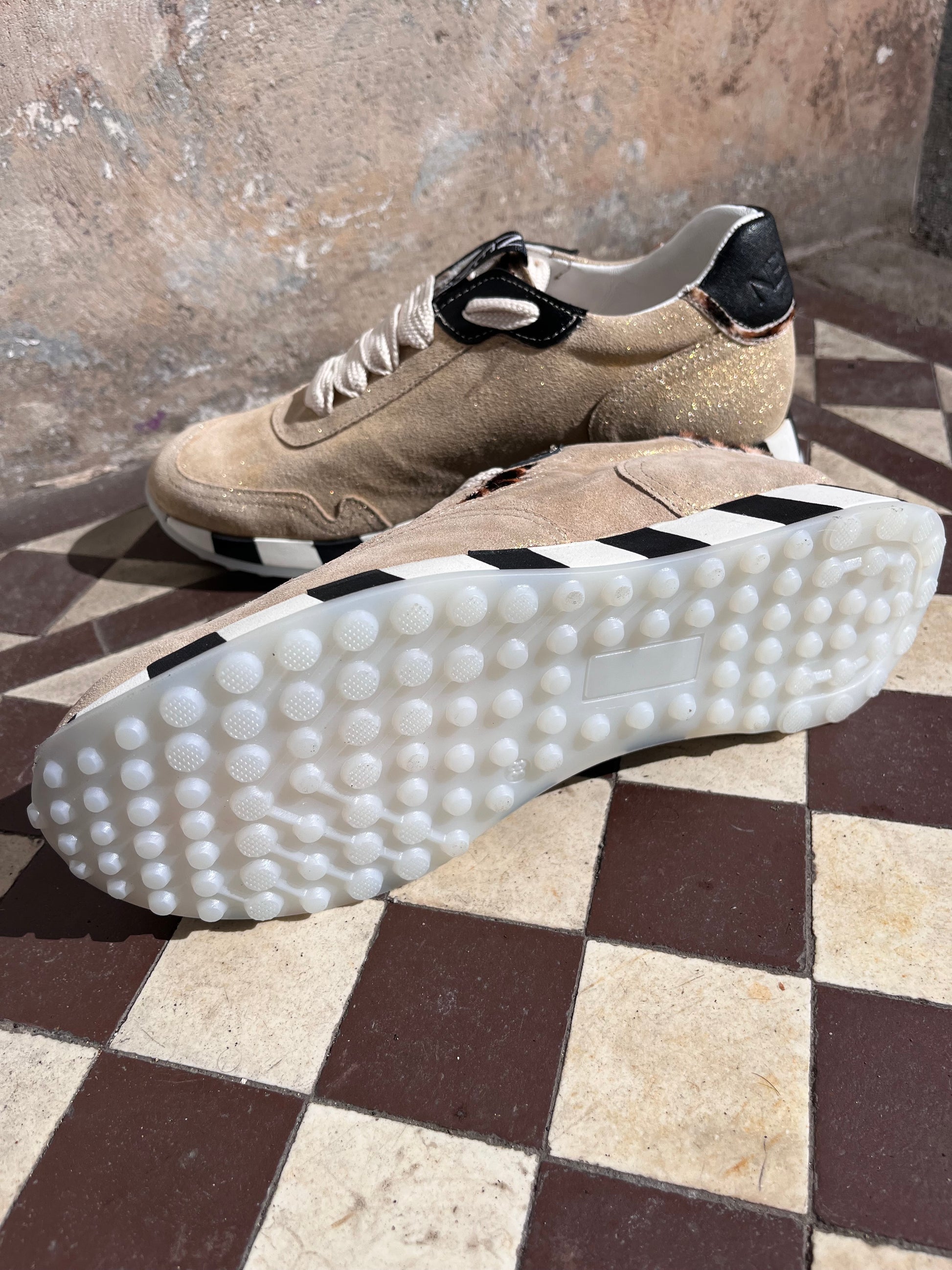 Metallic gold leather sneaker with a leopard print lightning bolt on the outer side.