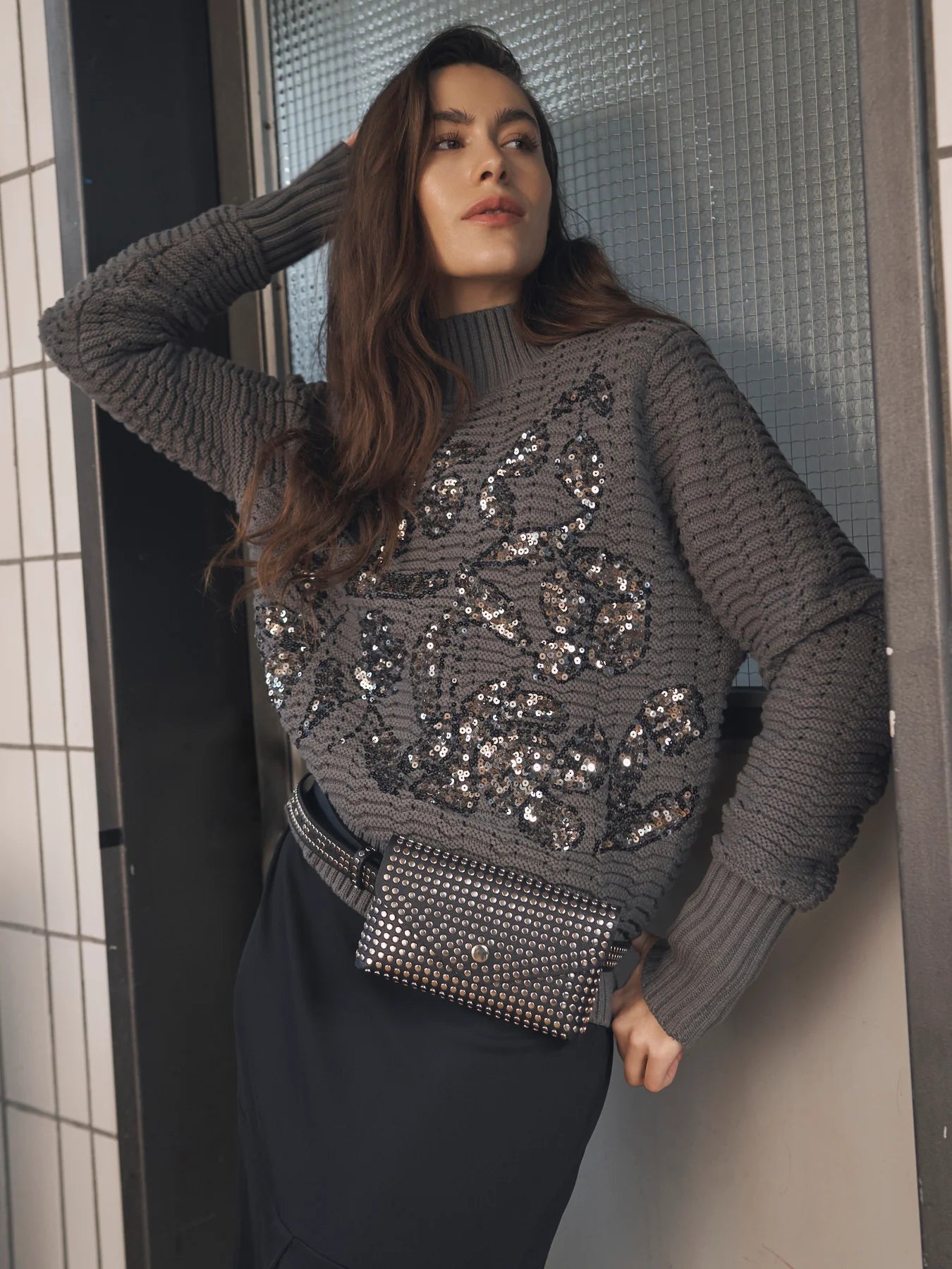 This knit sweater combines comfort and glamour with its decorative sequin pattern on the front. It is knitted in a structured quality with a wavy pattern and features a high ribbed collar, providing a warm and stylish expression. The ribbed cuffs at the sleeves and hem complete the well-balanced design.
